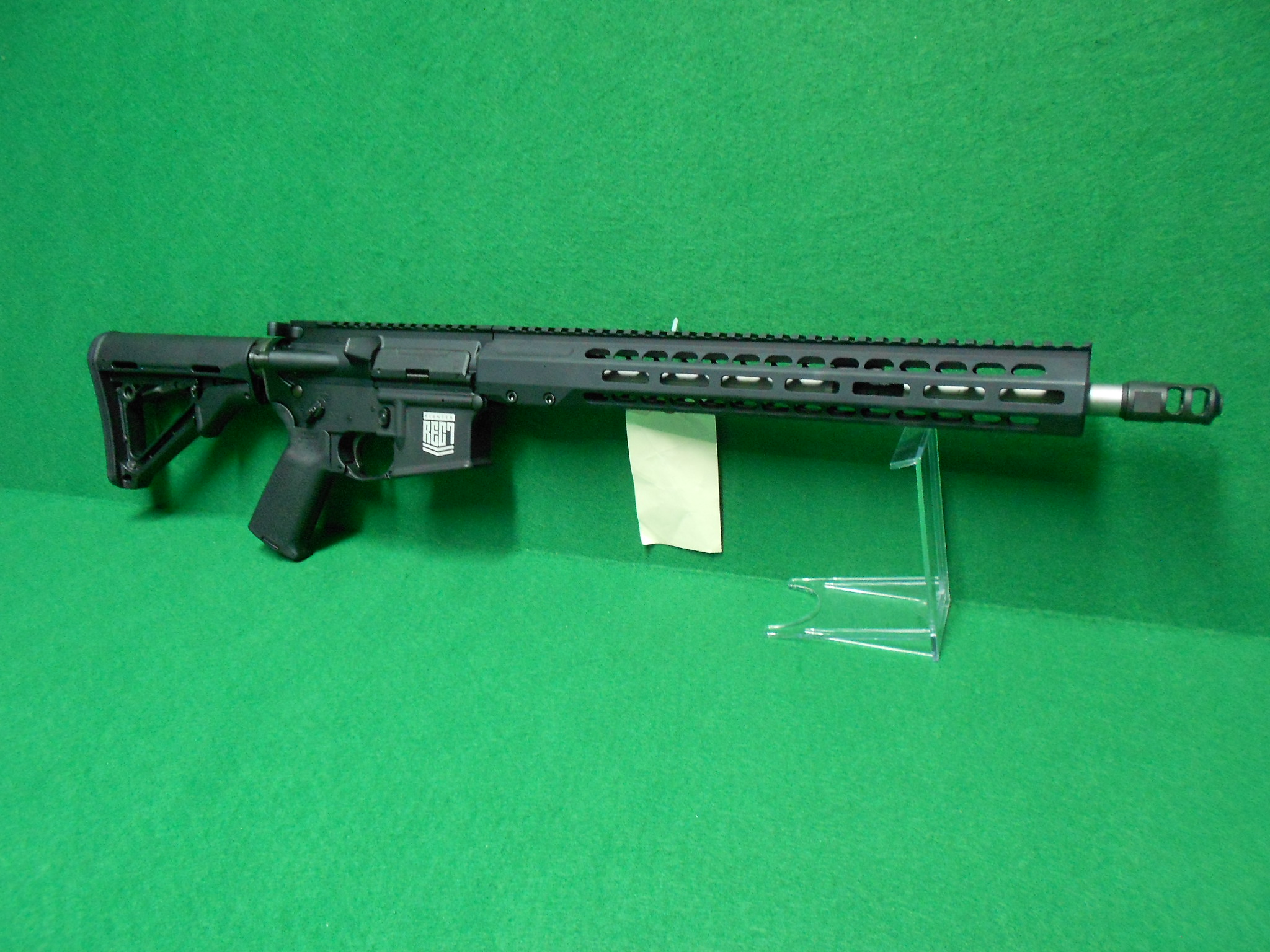 AR15 Selbstladebüchse von Barret in der Sonderausführung REC7 mit Edelstahlmatchlauf, Compensator, Magpul-Hinterschaft, Triggerguard und Griff. Die Waffe besitzt eine beidseitige